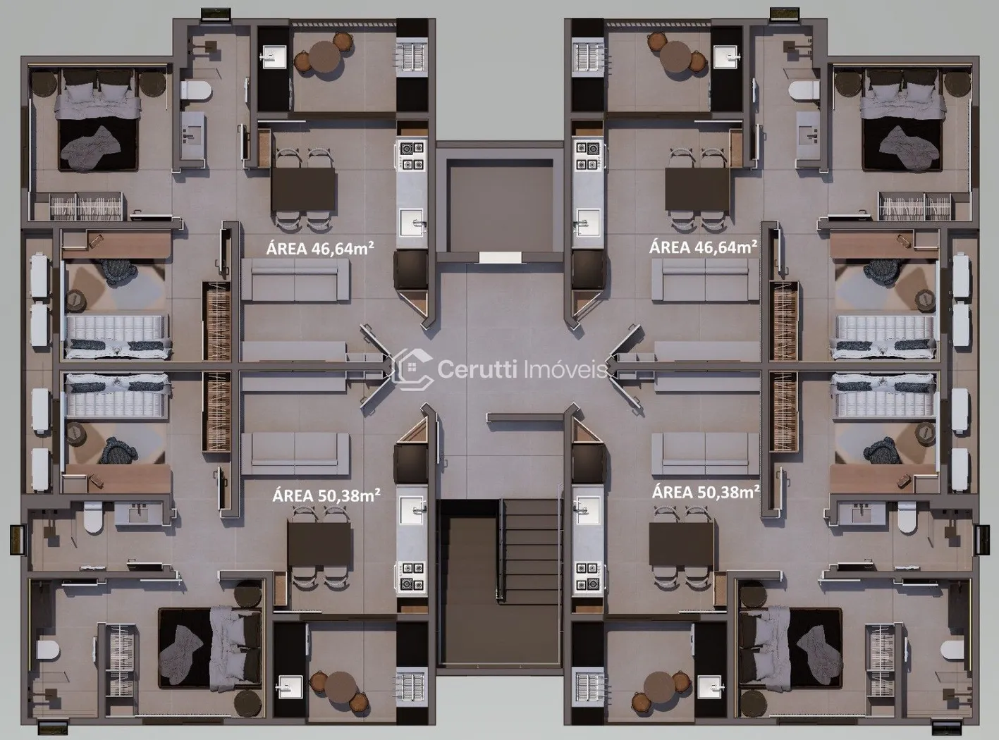 - Apartamento Tipo 01: Espaçosos 50,38 m², apresentando 1 suíte elegante, mais 1 dormitório, e igualmente beneficiado por uma sacada gourmet com churrasqueira.