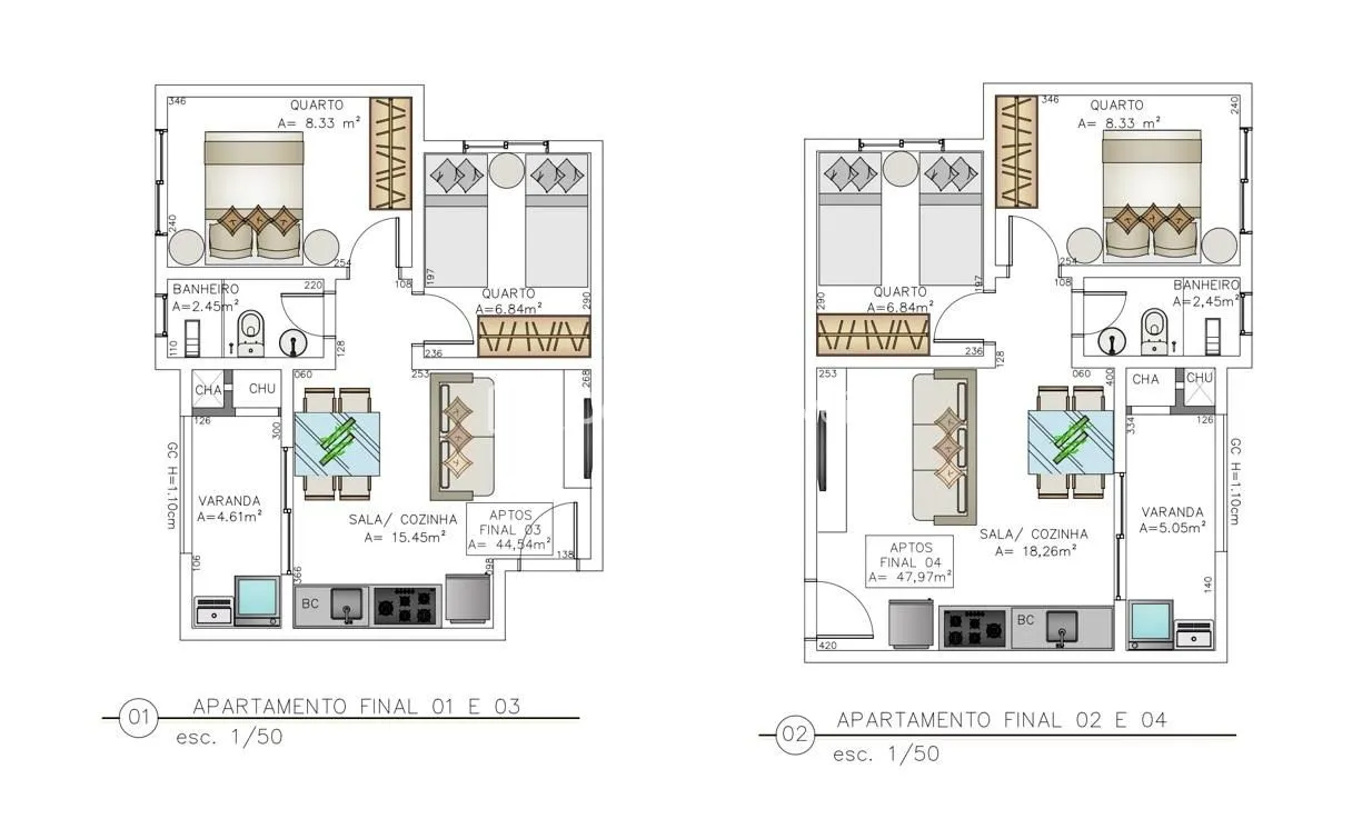 44 a 47 m² Privativos: Metragens ideais que maximizam cada centímetro, oferecendo funcionalidade e aconchego.