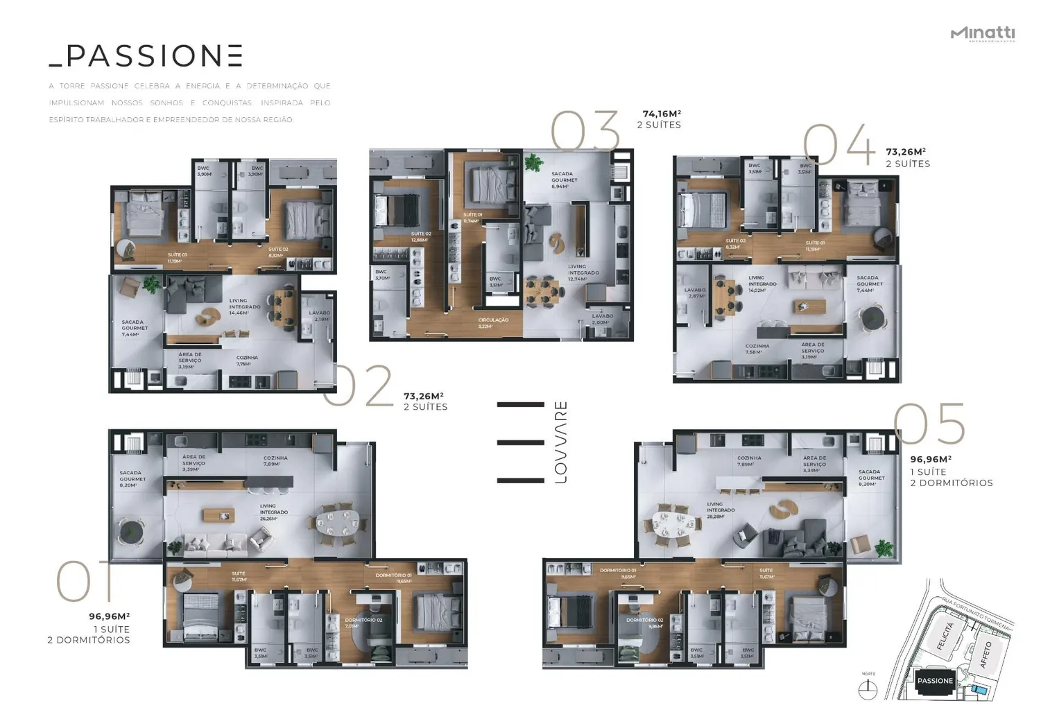 - Plantas de 96,96 m² com 1 suíte + 2 dormitórios. 2 Vagas (a partir de R$929.026,00)