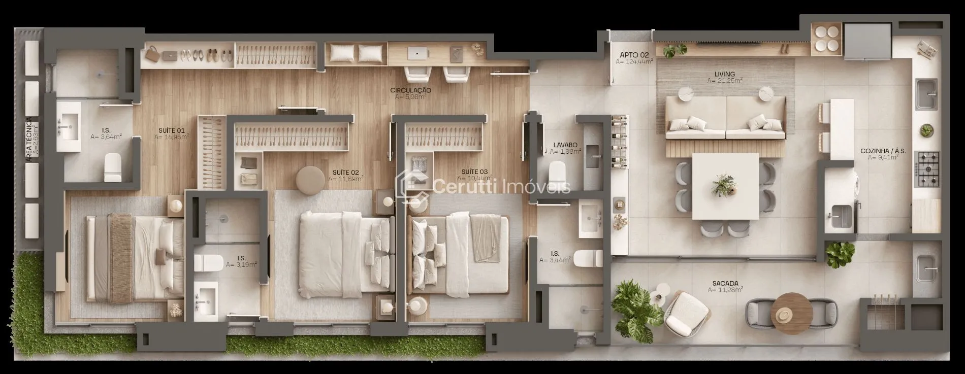 - Área total: 124,44 m²