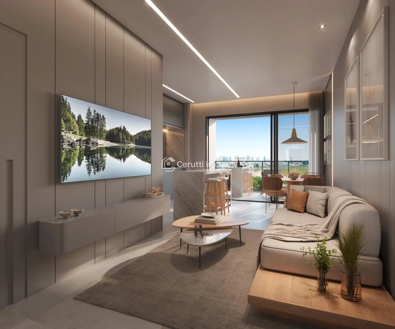 - Ambientes Amplos e Integrados: Um sofisticado living que se conecta harmoniosamente à sala de estar e à varanda, criando um fluxo contínuo de convivência e uma atmosfera de luminosidade natural.